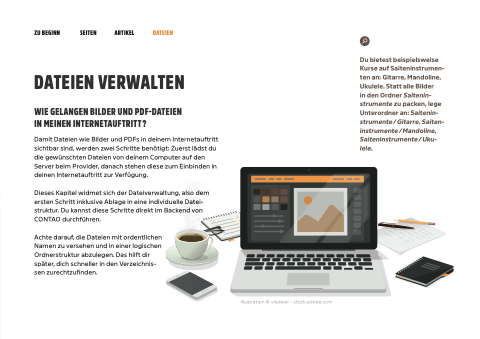 Dieses Kapitel widmet sich der Dateiverwaltung, also dem ersten Schritt inklusive Ablage in eine individuelle Datei- struktur. Du kannst diese Schritte direkt im Backend von CONTAO durchführen.