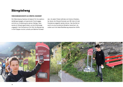 den. An jedem Posten befinden sich kleine Infostelen, bei denen die Hörspiel-Episoden per QR-Code mit dem Smartphone abgehört werden können. Das Sernftal ist somit um eine touristische Attraktion bereichert, die zudem auch die lokale Bevölkerung ansprechen dürfte.