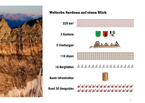 Welterbe Sardona auf einen Blick 329 km2 3 Kantone 0 Siedlungen 116 Alpen 16 Berghütten Kaum Infrastruktur Rund 30 Geoguides 3