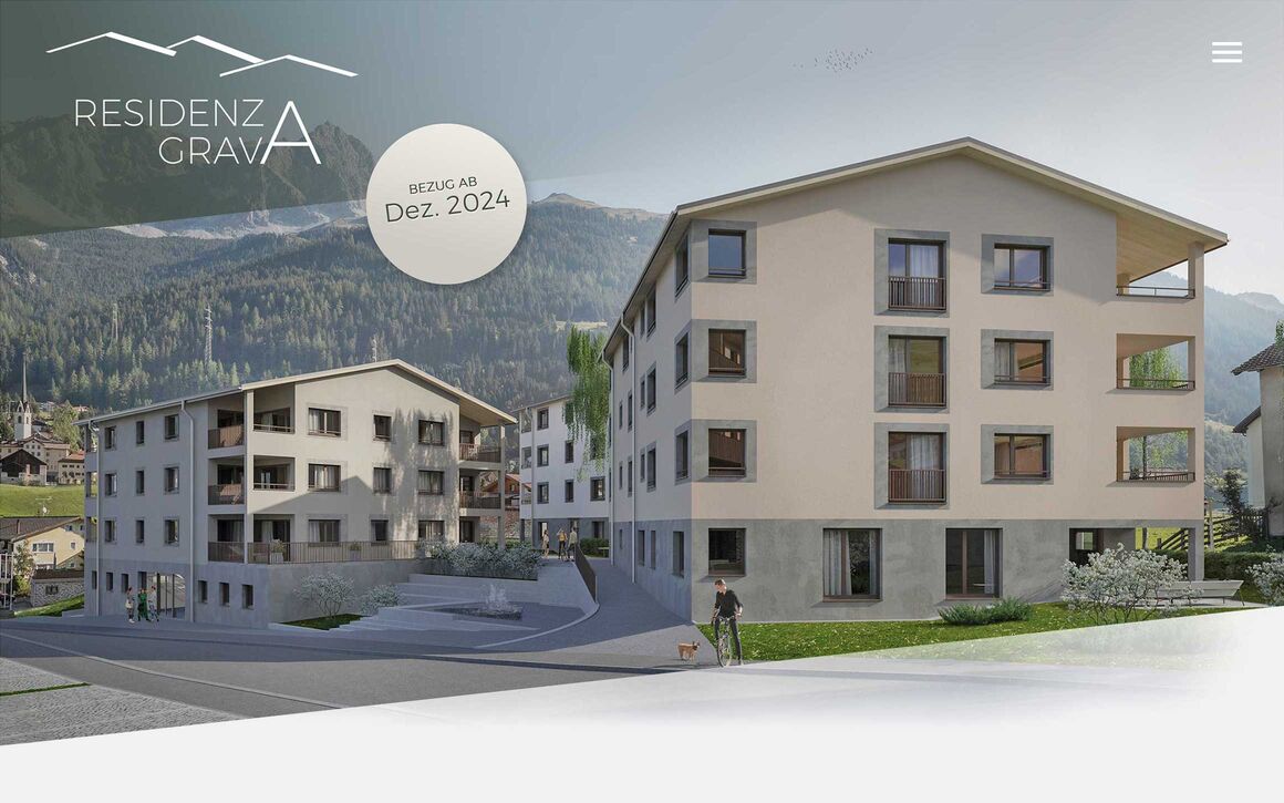 Im bekannten Mittelbündner Ferienort Savognin realisiert die INVIAS AG die Residenza Grava; ein Neubau-Projekt mit Erstwohnungen, Zweitwohnungen sowie bewirtschafteten Zweitwohnungen. Das durch INVIAS gelieferte Logo sowie das Farbkonzept bildete die Grundlage für die Entwicklung einen modernen, luftigen Designs, in welchem die Aussen- und Innen-Visualisierungen des Bauprojekts optimal zur Geltung kommen. Der Webseiten-Inhalt inklusive des Wohnungsspiegels kann durch die Immobilien-Verwaltungen auf einfache Weise selbstständig verwaltet werden. Für Curvér Immobilien + Treuhand AG wurde zudem eine vollflächige Schaufensterbeschriftung umgesetzt. In den im Design ausgesparten Bildschirmen können aktuelle Verfügbarkeiten und Informationen zum Projekt angezeigt werden.